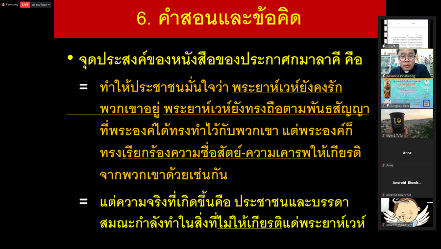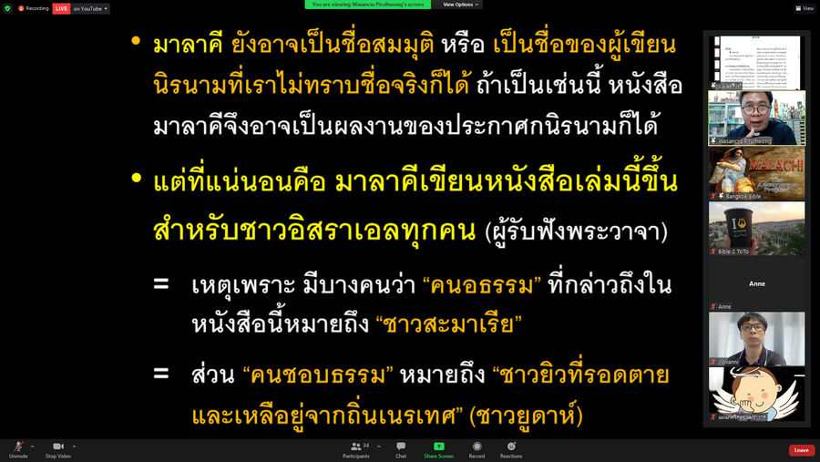 แผนกพระคัมภีร์ ฝ่ายงานอภิบาล อัครสังฆมณฑลกรุงเทพฯ จัดโครงการอบรมพระคัมภีร์พันธสัญญาเดิม หัวข้อ “หนังสือประกาศกโยเอล ประกาศกมาลาคี และประกาศกโอบาดีย์” โดย คุณพ่อวสันต์ พิรุฬห์วงศ์ คณะสติกมาติน เป็นวิทยากร ในวันเสาร์ที่ 5, 12, 19 และ 26 กุมภาพันธ์ ค.ศ. 2022 เวลา 09.00-12.00 น. ในรูปแบบออนไลน์ด้วยโปรแกรม ZOOM ขณะออนไลน์มีผู้เข้าร่วม 38 คน ในวันเสาร์ที่ 5 กุมภาพันธ์ และในวันเสาร์ที่ 12 กุมภาพันธ์ มีผู้เข้าร่วม 45 คน มีการถ่ายทอดสดทาง YouTube Live ช่องแผนกพระคัมภีร์กรุงเทพฯ มีผู้เข้ารับชมสูงสุด 15 คน