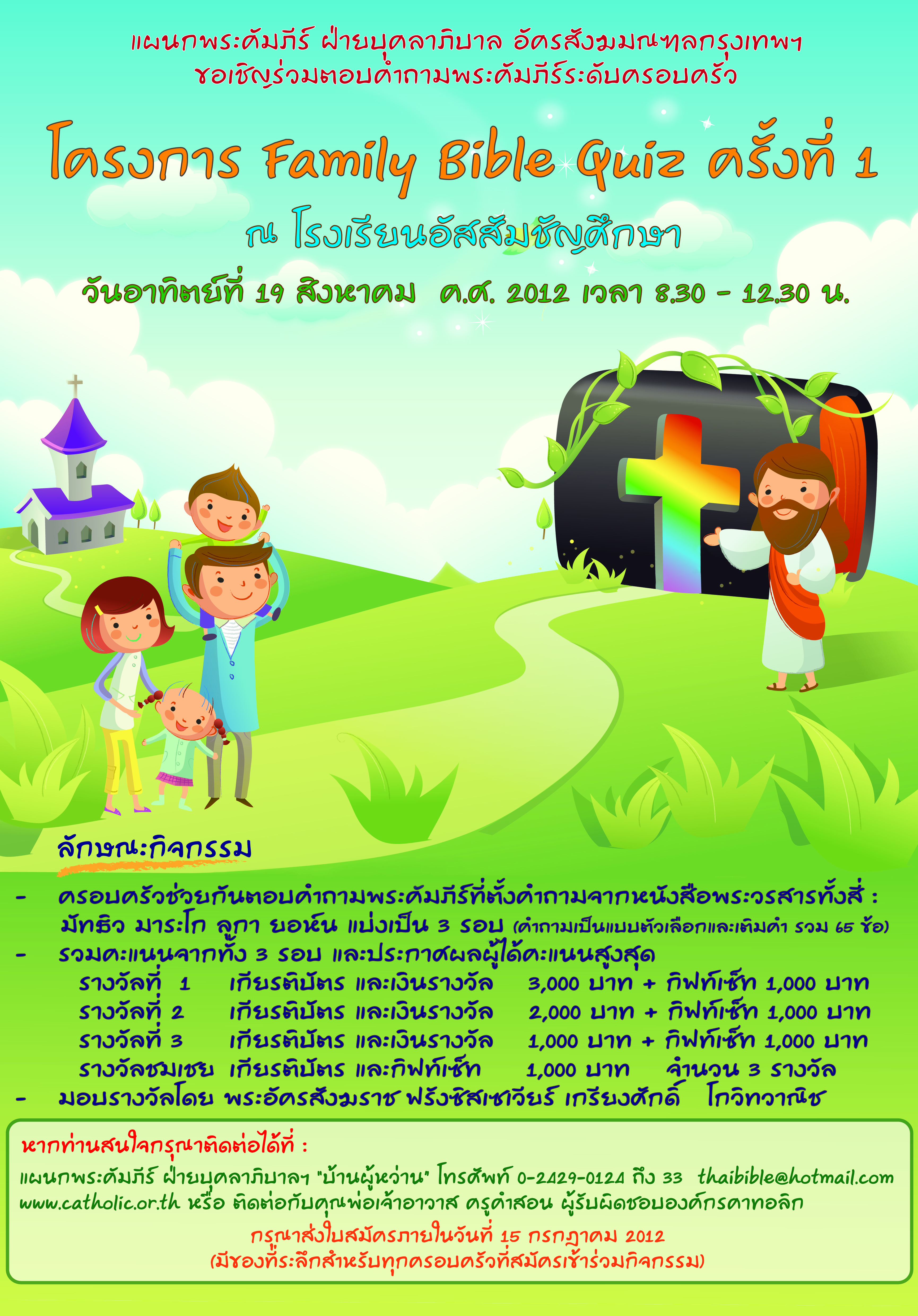 แผนกพระคัมภีร์ ฝ่ายบุคลาภิบาล อัครสังฆมณฑลกรุงเทพฯ ขอเชิญร่วมตอบคำถามพระคัมภีร์ระดับครอบครัว โครงการ " Family Bible Quiz ครั้งที่ 1" ณ โรงเรียนอัสสัมชัญศึกษา วันอาทิตย์ที่ 19 สิงหาคม ค.ศ.2012 เวลา 8.30 - 12.30 น.