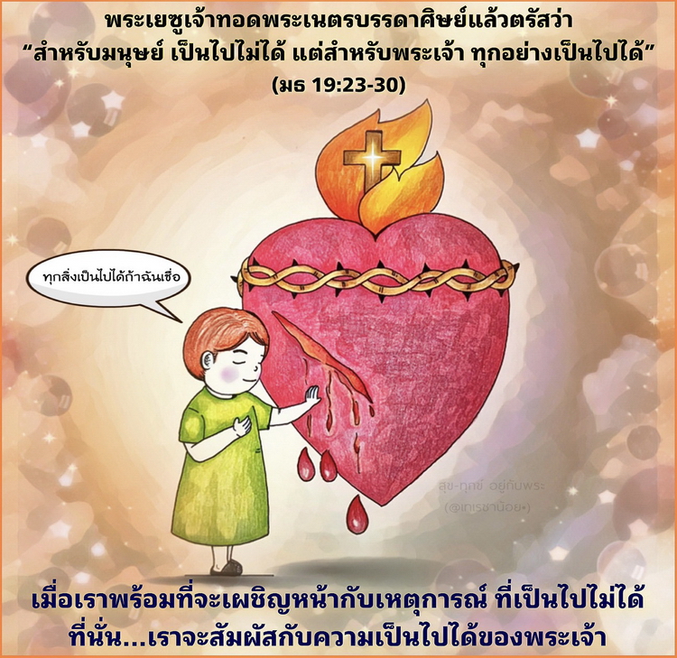 พระเยซูเจ้าทอดพระเนตรบรรดาศิษย์แล้วตรัสว่า “สำหรับมนุษย์ เป็นไปไม่ได้ แต่สำหรับพระเจ้า ทุกอย่างเป็นไปได้” (มธ. 19:23-30)