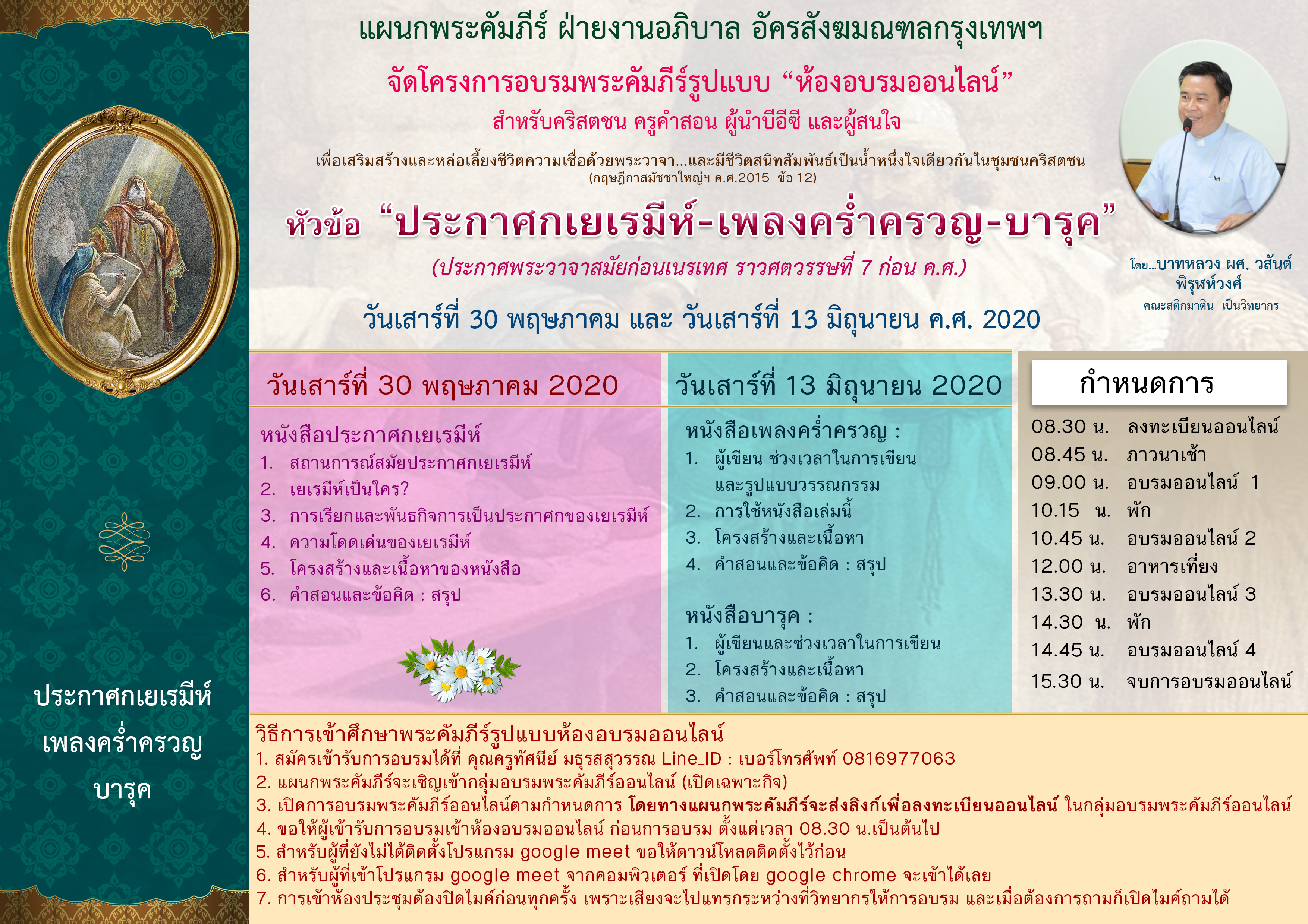แผนกพระคัมภีร์ ฝ่ายงานอภิบาล อัครสังฆมณฑลกรุงเทพฯ จัดคอร์สการอบรมพระคัมภีร์วันเสาร์ ในรูปแบบห้องอบรมพระคัมภีร์ออนไลน์ เพื่อคริสตชนจะได้ร่วมศึกษาพระคัมภีร์ ในช่วงเวลา stay at home หยุดเชื้อเพื่อชาติ (เชื้อไวรัสโควิด_19) และเป็นการเปิดการดำเนินการอบรมแบบ New normal and New Evangelization โดยผ่านสื่อเทคโนโลยี อีกด้วย