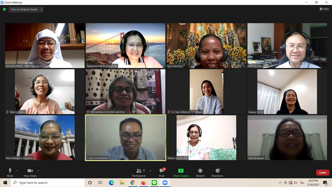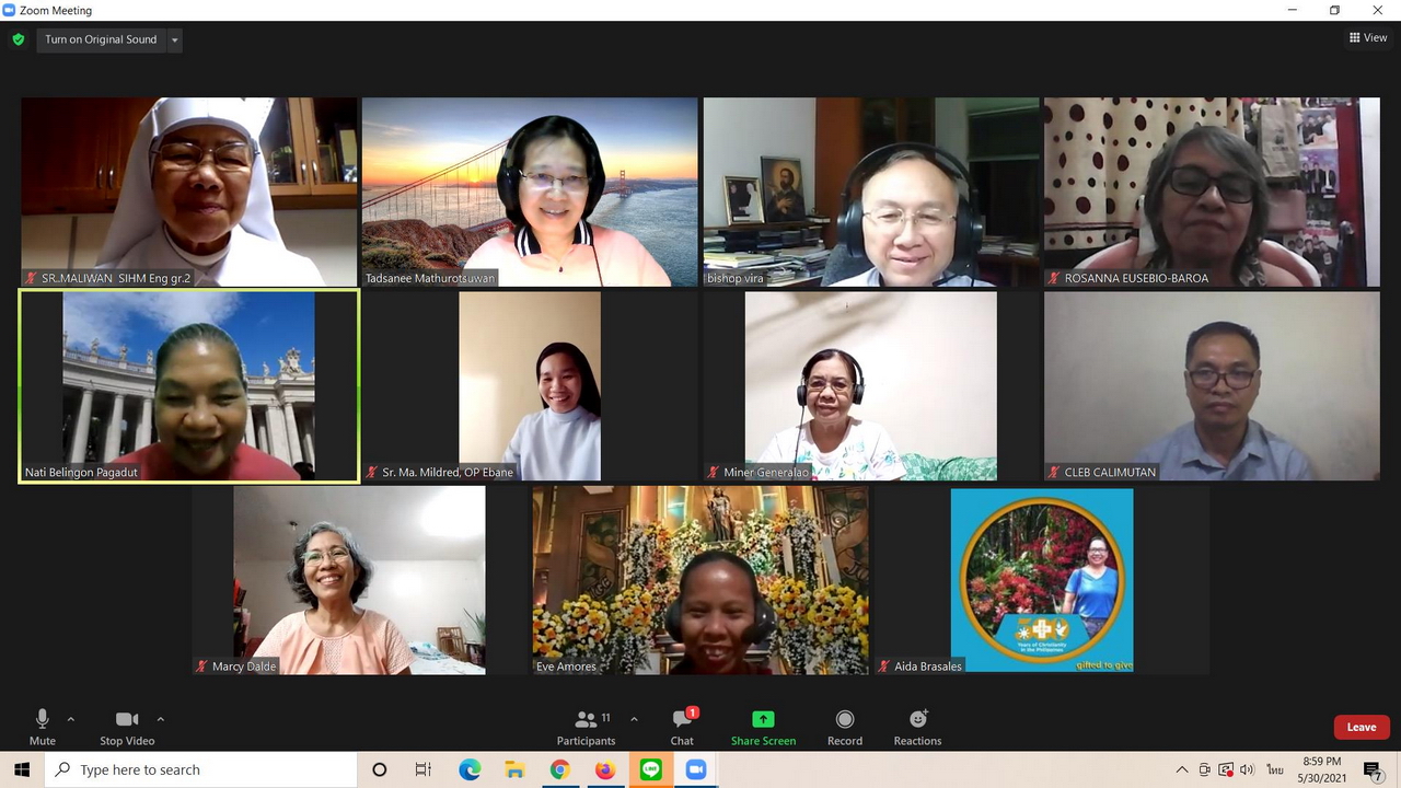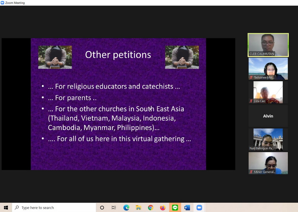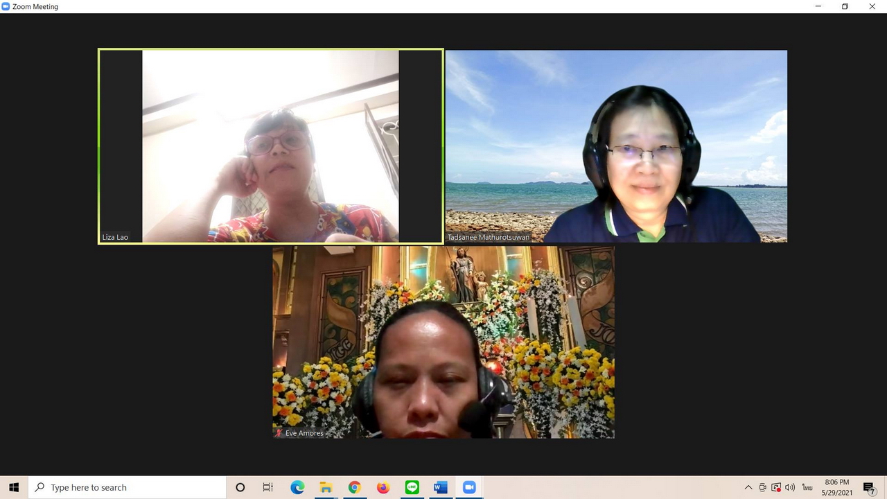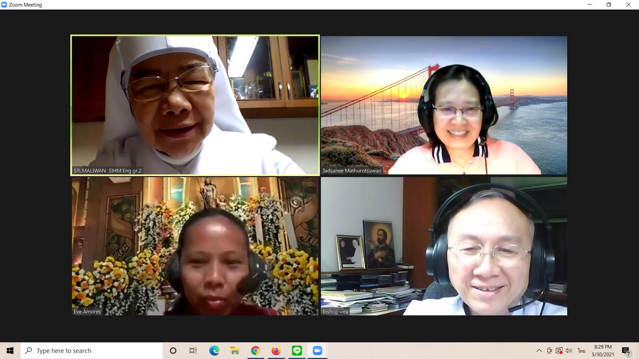 โดยใช้โปรแกรม Zoom มีสมาชิกเข้าร่วมภาวนาในวันที่ 29-30 พฤษภาคม 2021 ประมาณ 12 ท่าน และมีสมาชิกจากประเทศไทยที่เป็นคณะกรรมการพระคัมภีร์ในสังฆมณฑลและคณะนักบวช เข้าร่วมฯ 6 ท่าน คือ บิชอปวีระ อาภรณ์รัตน์ Co-president คณะกรรมการคาทอลิกฯ แผนกพระคัมภีร์ สภาพระสังฆราชฯ และบิชอปที่ปรึกษาของ CBF-SEA คุณแม่มะลิวัลย์ ปรมัตถ์วิโรจน์ อธิการิณีคณะภคินีผู้รับใช้ดวงหทัยนิรมลของพระแม่มารีย์ ซิสเตอร์ขวัญเรียม เพียรรักษา คณะรักกางเขนแห่งจันทบุรี ซิสเตอร์สุวรรณี พันธ์วิไล คณะรักกางเขนแห่งอุบลราชธานี คุณครูอรุณประภา สุขกะสี แผนกพระคัมภีร์ สังฆมณฑลจันทบุรี และคุณครูทัศนีย์ มธุรสสุวรรณ แผนกพระคัมภีร์ อัครสังฆมณฑลกรุงเทพฯ ผู้ประสานงาน CBF-SEA ในประเทศไทย