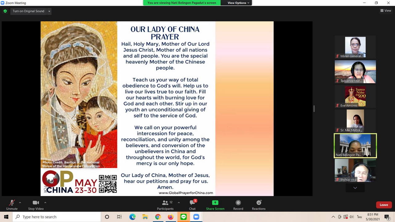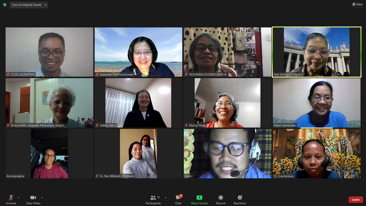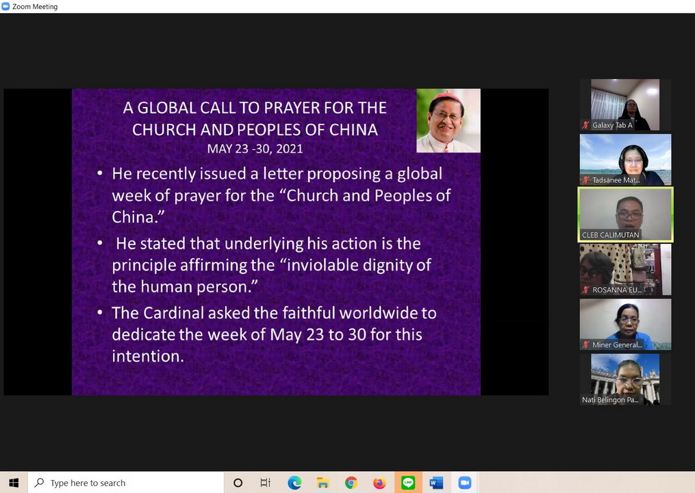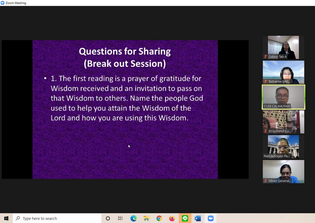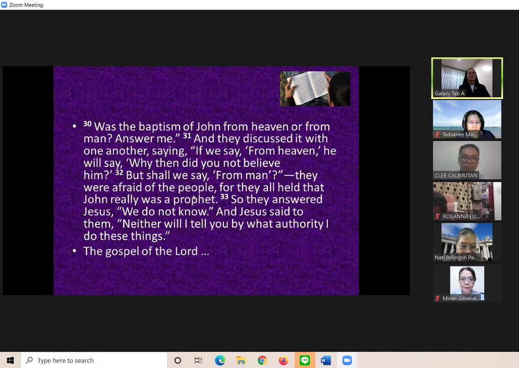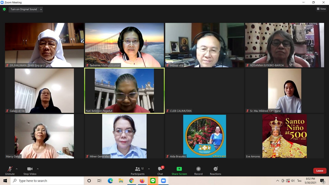 โดยใช้โปรแกรม Zoom มีสมาชิกเข้าร่วมภาวนาในวันที่ 29-30 พฤษภาคม 2021 ประมาณ 12 ท่าน และมีสมาชิกจากประเทศไทยที่เป็นคณะกรรมการพระคัมภีร์ในสังฆมณฑลและคณะนักบวช เข้าร่วมฯ 6 ท่าน คือ บิชอปวีระ อาภรณ์รัตน์ Co-president คณะกรรมการคาทอลิกฯ แผนกพระคัมภีร์ สภาพระสังฆราชฯ และบิชอปที่ปรึกษาของ CBF-SEA คุณแม่มะลิวัลย์ ปรมัตถ์วิโรจน์ อธิการิณีคณะภคินีผู้รับใช้ดวงหทัยนิรมลของพระแม่มารีย์ ซิสเตอร์ขวัญเรียม เพียรรักษา คณะรักกางเขนแห่งจันทบุรี ซิสเตอร์สุวรรณี พันธ์วิไล คณะรักกางเขนแห่งอุบลราชธานี คุณครูอรุณประภา สุขกะสี แผนกพระคัมภีร์ สังฆมณฑลจันทบุรี และคุณครูทัศนีย์ มธุรสสุวรรณ แผนกพระคัมภีร์ อัครสังฆมณฑลกรุงเทพฯ ผู้ประสานงาน CBF-SEA ในประเทศไทย